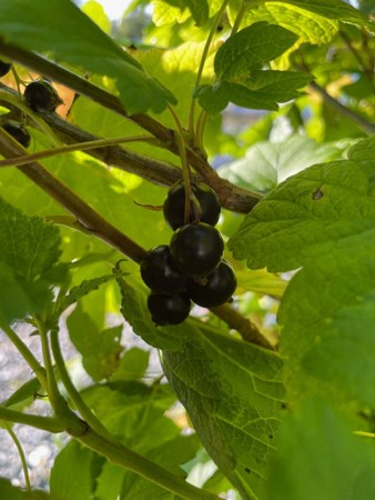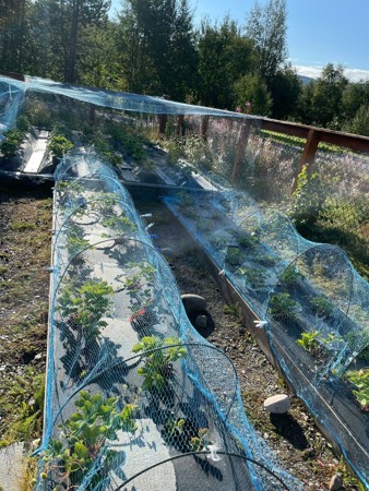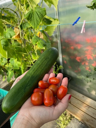 I drivhuset plukker vi tomater og agurker ukentlig, og kjøkkenhagen er full av deilige bær! Vi har bringebær, rips, solbær og jordbær. Vi har også rabarbra, gulrøtter, div urter, vårløk, sukkererter og poteter.